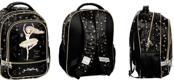 Opis proizvoda Školski ruksak Balerina Dancing with heart opremljen je s dva prostrana pretinca zatvorena patentnim zatvaračem i jednim prostranim